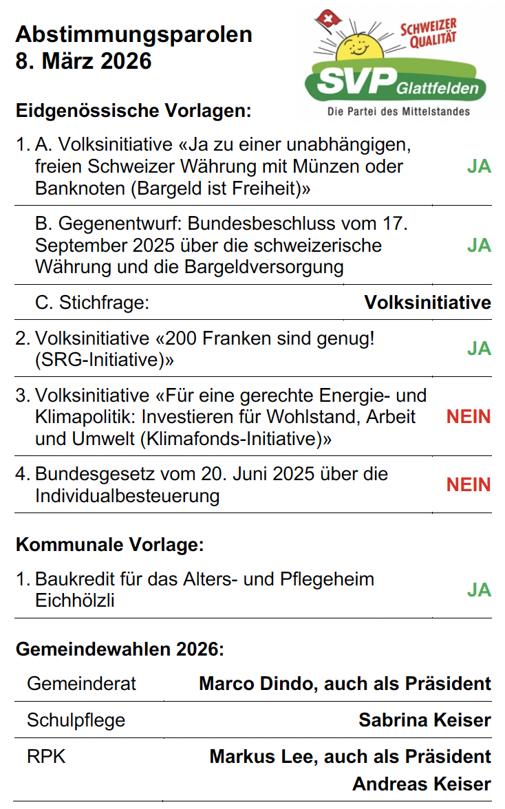 SVP Glattfelden c/o Andreas Keiser Unterwerkstrasse 6, 8192 Zweidlen
