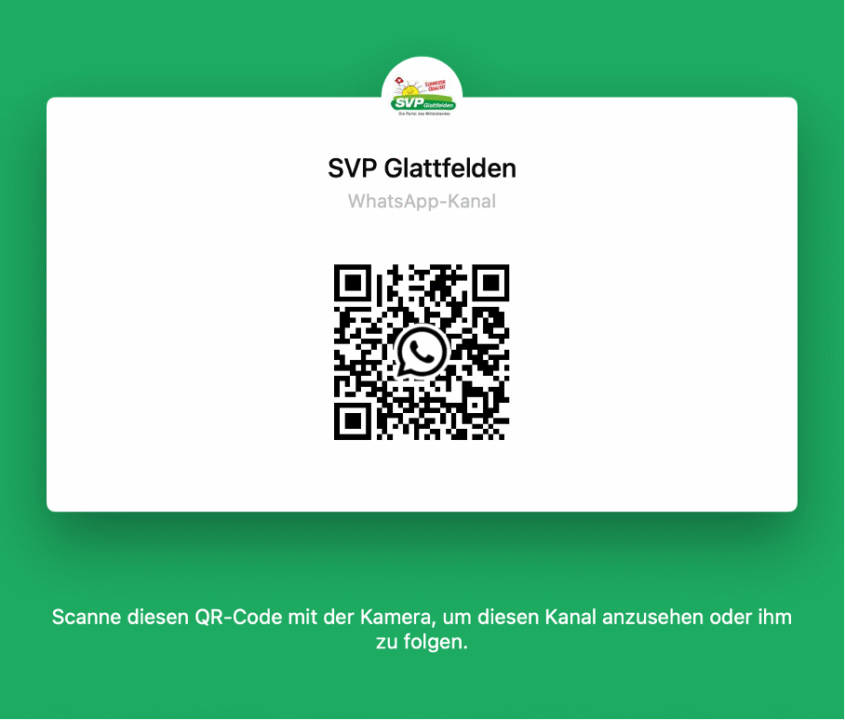 Folge dem Kanal SVP Glattfelden auf WhatsApp: https://whatsapp.com/channel/0029VbC1yziBPzjWl3LzRd3w